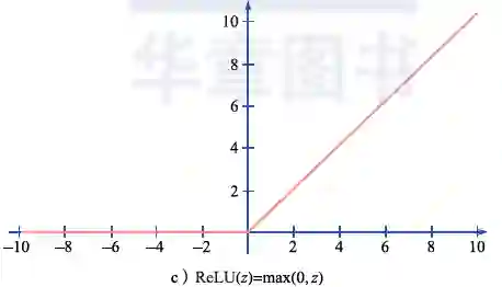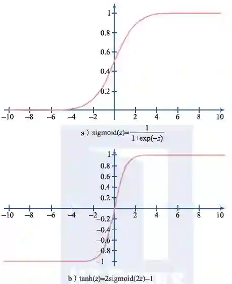 但是,由于阶跃函数本身不连续,对于机器学习而言不是一个好的选择,因此在人们设计人工神经网络的时候通常采用连续的激活函数,比如Sigmoid函数、双曲正切函数(tanh)、校正线性单元(ReLU)等。它们的数学形式和函数形状分别如图2.8所示。