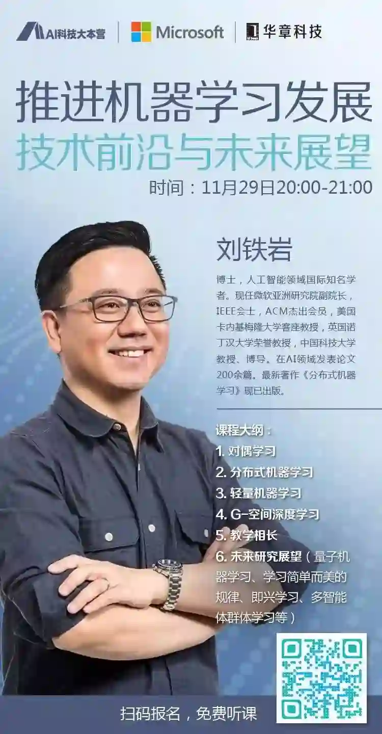 刘铁岩,博士,人工智能领域国际知名学者。现任微软亚洲研究院副院长,IEEE会士,ACM杰出会员,美国卡内基梅隆大学客座教授,英国诺丁汉大学荣誉教授,中国科技大学教授、博导。在AI领域发表论文200余篇。最新著作《分布式机器学习》现已出版。