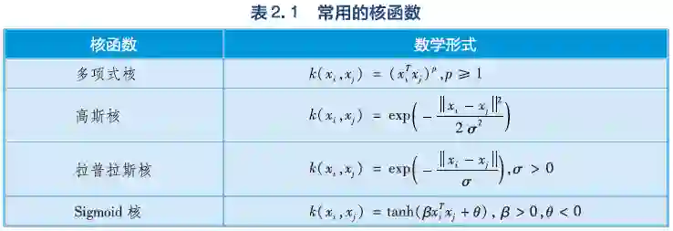 至此,我们弄清楚了核函数是如何和空间变换发生联系的。核函数可以有很多不同的选择,表2.1列出了几种常用的核函数。