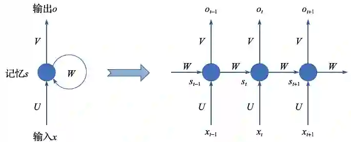 循环神经网络(Recurrent Neural Network,RNN)[14]的设计也有很强的仿生学基础。我们可以联想一下自己如何读书看报。当我们阅读一个句子时,不会单纯地理解当前看到的那个字本身,相反我们之前读到的文字会在脑海里形成记忆,而这些记忆会帮助我们更好地理解当前看到的文字。这个过程是递归的,我们在看下一个文字时,当前文字和历史记忆又会共同成为我们新的记忆,并对我们理解下一个文字提供帮助。其实,循环神经网络的设计基本就是依照这个思想。我们用表示在