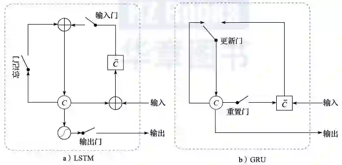 和全连接神经网络、卷积神经网络类似,当循环神经网络时域展开以后,也会遇到梯度消减的问题。为了解决这个问题,人们提出了一套依靠门电路来控制信息流通的方法。也就是说,在循环神经网络的两层之间同时存在线性和非线性通路,而哪个通路开、哪个通路关或者多大程度上开关则由一组门电路来控制。这个门电路也是带参数并且这些参数在神经网络的优化过程中是可学习的。比较著名的两类方法是LSTM[43]和GRU[44](如图2.17所示)。GRU相比LSTM更加简单一些,LSTM有三个门电路(输入门、忘记门、输出门),而GRU则有两个门电路(重置门、更新门),二者在实际中的效果类似,但GRU的训练速度要快一些,因此近年来有变得更加流行的趋势。