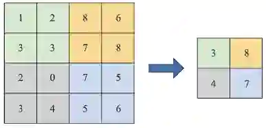 除了卷积以外,池化也是卷积神经网络的重要组成部分。池化的目的是对原特征映射进行压缩,从而更好地体现图像识别的平移不变性,并且有效扩大后续卷积操作的感受野。池化与卷积不同,一般不是参数化的模块,而是用确定性的方法求出局部区域内的平均值、中位数,或最大值、最小值(近年来,也有一些学者开始研究参数化的池化算子[39])。图2.11描述了对图像局部进行2×2的最大值池化操作后的效果。