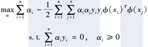 为了求解上述有约束的优化问题,一种常用的技巧是使用拉格朗日乘数法将其转换成对偶问题进行求解。具体来讲,支持向量机对应的对偶问题如下: