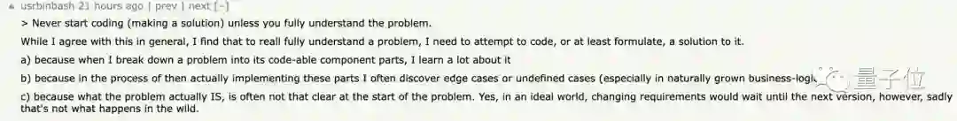 但也有一些网友认为:对于小型的、偏算法的问题,先在纸上或脑海中过一遍,比上来就写代码有效率的多。
