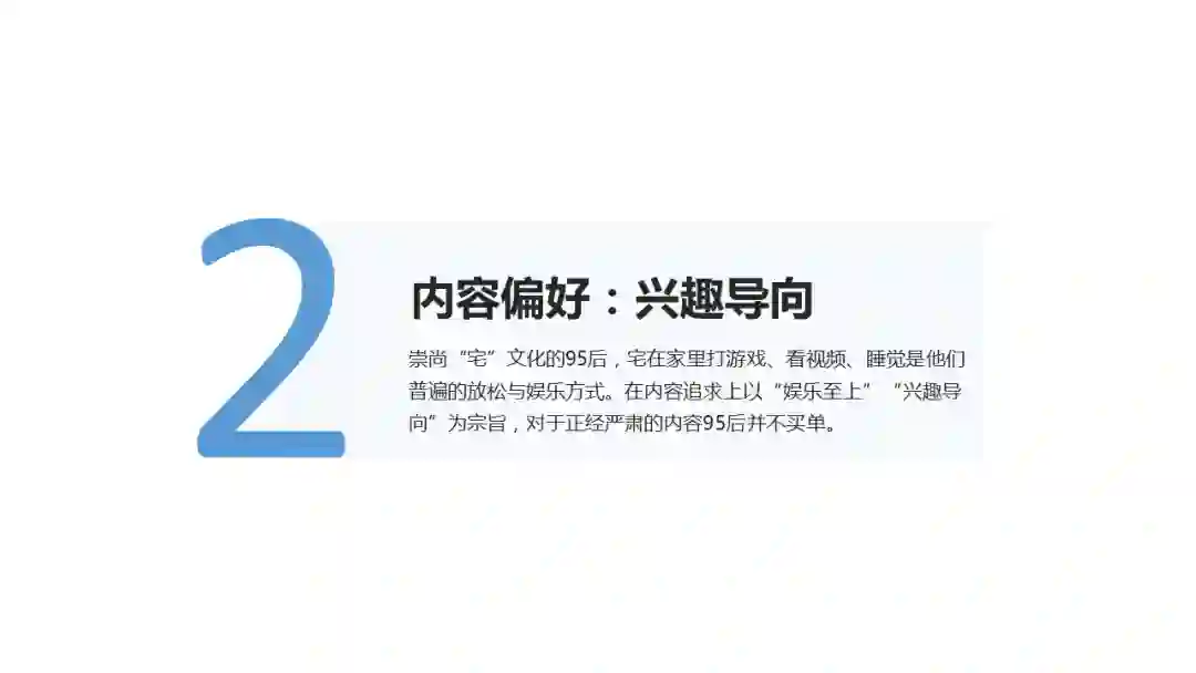 崇尚“宅”文化的95后,宅在家里打游戏、看视频、睡觉是他们普遍的放松与娱乐方式。在内容追求上以“娱乐至上”“兴趣导向”为宗旨,对于正经严肃的内容95后并不买单。