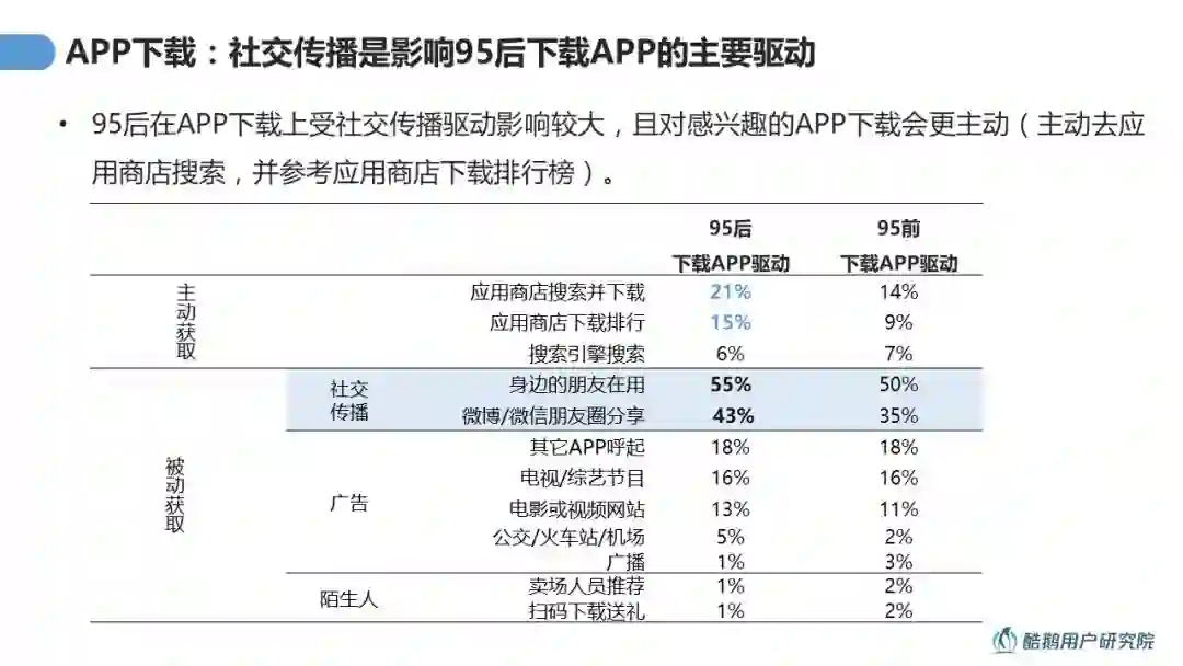 95后用户每天使用的APP中最高频的是社交类应用,社交媒体是95后获取感兴趣内容的主要渠道,内容获取社交化,社交传播的影响对于95后用户下载新的APP起关键作用。