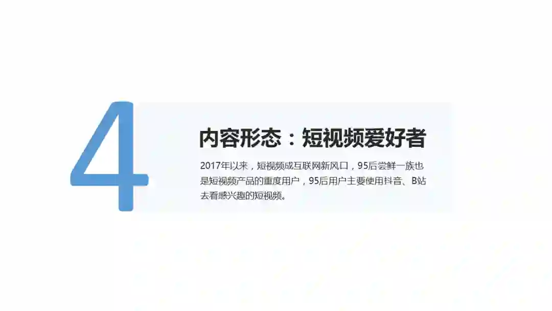2017年以来,短视频成互联网新风口,95后尝鲜一族也是短视频产品的重度用户,95后用户主要使用抖音、B站去看感兴趣的短视频。