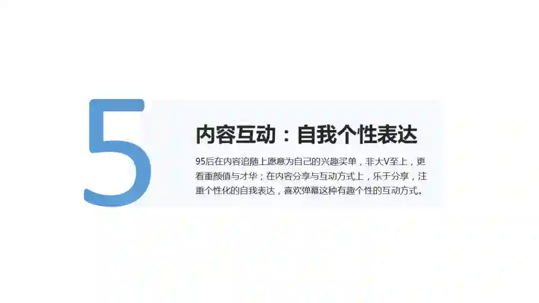 95后在内容追随上愿意为自己的兴趣买单,非大V至上,更看重颜值与才华;乐于分享,注重个性化的自我表达,喜欢弹幕这种有趣个性的互动方式。