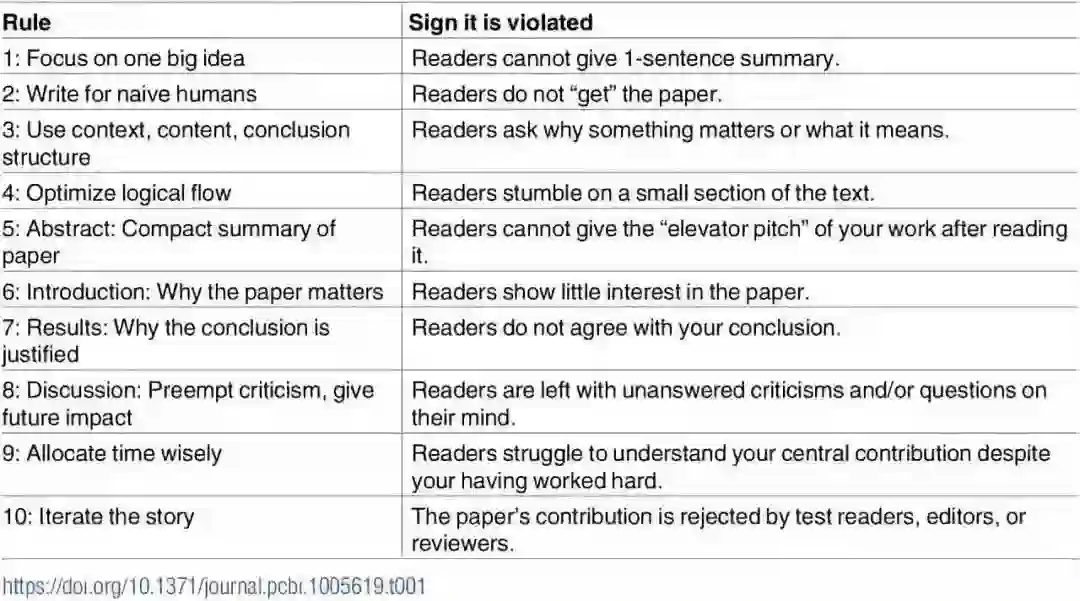 前四条规则可以应用于一篇论文的所有部分,甚至是其他形式的交流,如会谈和海报等。中间四条规则涉及论文每个主要部分的主要目标。最后两条规则为有效构建论文原稿提供了过程启发式的指导。接下来就随我们一起,了解论文写作的奥义。