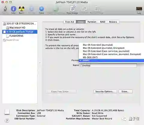 3、在“擦除”选项卡下,从菜单列表中选择“exFAT”文件类型;