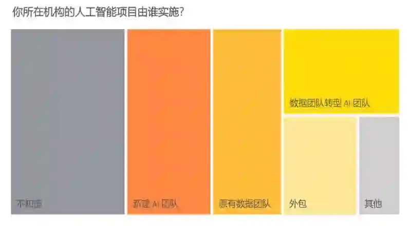 在人工智能项目实施上,18%的机构直接由原有数据团队实施,14%的机构为数据团队转型的AI团队实施,22%的机构新建AI团队实施项目,10%的机构将这一工作外包出去。