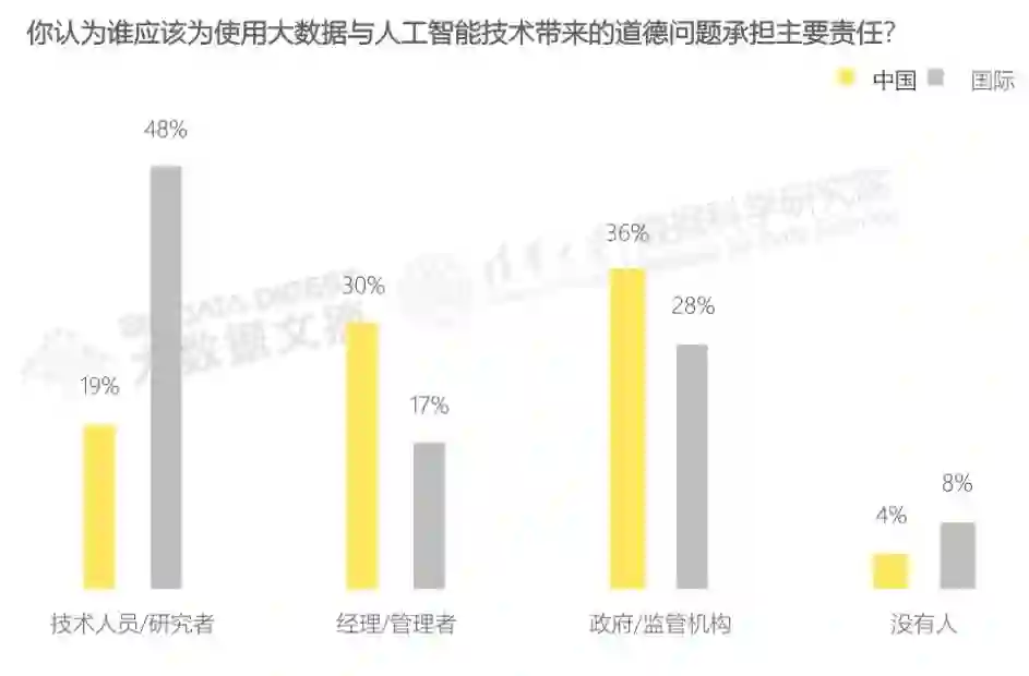 在我们的问卷反馈中,针对“你认为谁应该为使用大数据与人工智能技术带来的道德问题承担主要责任”这一问题,36%的受访者选择了政府/监管机构,30%选择了管理者、19%选择了技术人员。