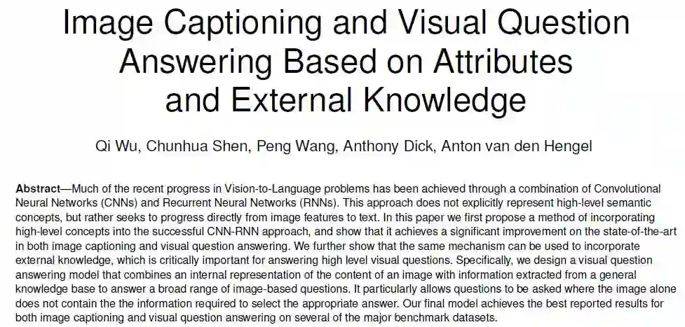 视觉问答问题最近取得的许多进展是通过卷积神经网络(CNN)和递归神经网络(RNN)的组合来实现的。这种方法没有明确表示高层次的语义概念,而是试图直接建立图像特征和文本特征之间的关系。本文首先提出一种将高层次的概念与CNN-RNN成功结合的方法,并且表明它在图像语义生成和视觉问答方面都取得了显着的进步。进一步研究表明,同样的机制可以用来结合外部的知识,这对于回答高层次的视觉问题是至关重要的。