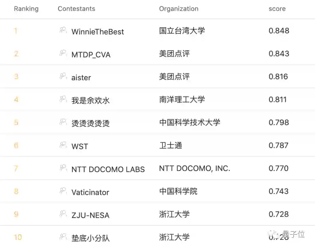 在任务一中,国立台湾大学(WinnieTheBest)和美团点评(MTDP_CVA)的团队分别获得了冠亚军,而季军的团队也同样来自美团(aister)。