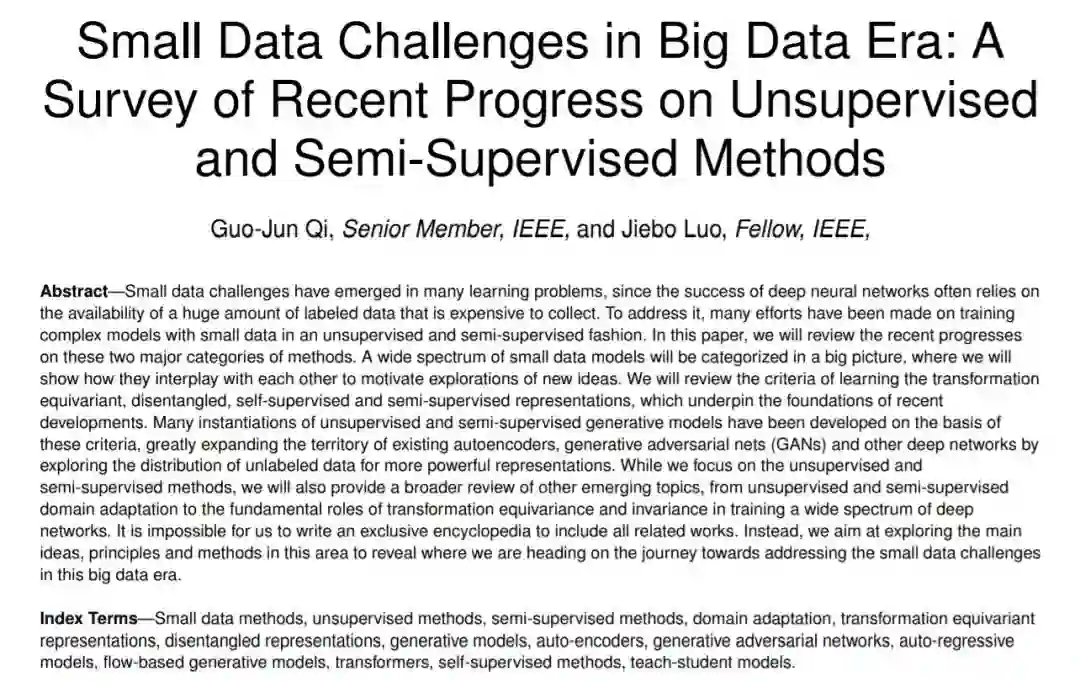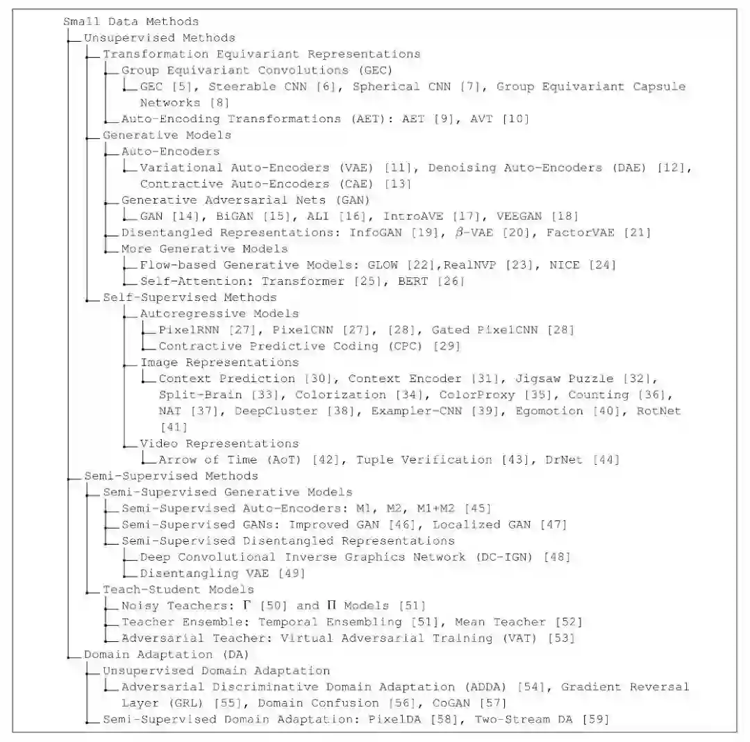 在许多学习问题中都出现了小的数据挑战,由于深度神经网络的成功往往依赖于收集大量昂贵的标记数据。为了解决这一问题,人们在以无监督和半监督的方式训练具有小数据的复杂模型方面做了许多努力。本文就这两大类方法的研究进展进行综述。我们将在一个大的图谱中对一系列小数据模型进行分类,在这里我们将展示它们如何相互作用,从而激发对新思想的探索。我们将回顾学习转换等变、解纠缠、自我监督和半监督表示的标准,这些标准为最近的发展奠定了基础。许多无监督和半监督生成模型的实例都是在这些标准的基础上开发的,通过探索无标记数据的分布以获得更强大的表示,极大地扩展了现有自动编码器、生成对抗网(GANs)和其他深层网络的领域。在关注无监督和半监督方法的同时,我们还将对其他新出现的主题进行更广泛的回顾,从无监督和半监督领域的自适应,到转换等方差和不变性在训练大范围深度网络中的基本作用。我们旨在探索这一领域的主要理念、原则和方法,以揭示我们在解决大数据时代的小数据挑战的道路上的前进方向。