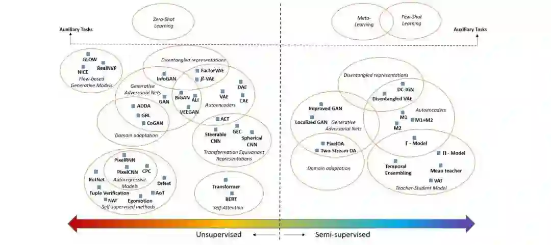 本研究以无监督和半监督方法为研究重点,以无标记的例子来解决小数据问题。虽然我们将不回顾ZSL和FSL方法,利用辅助任务的信息,这将是有益的,我们开始从一个大的图谱详述所有这些方法。这将使我们更好地理解我们在克服小数据挑战的过程中所处的位置。