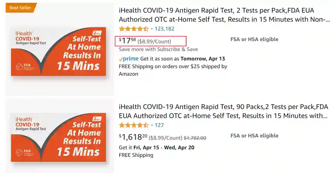 按照九安医疗1月公告与美国ACC的合同,约合为5.1美元/人份(32元人民币),批量采购的价格远超国内和欧洲的价格。零售市场,九安子公司iHealth的OTC家用抗原试剂盒在亚马逊的单价约合9美元/人份(57元人民币)。