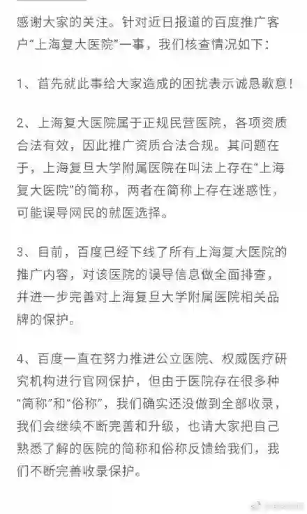 9月9日凌晨,百度官微博发布声明回应“上海复大医院”推广一事。百度称上海复大医院的医院名称与上海复旦大学相关附属医院的简称存在一定的语义相似性,误导了网民的就医选择,并对这次事件深表歉意。除此之外,百度还表示将持续推进的公立医院品牌保护项目,保护之后搜索相关关键词将不会出现商业广告。