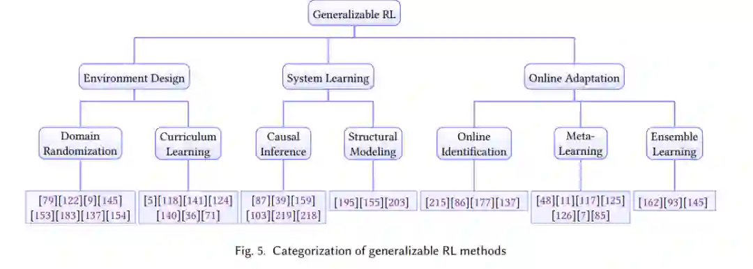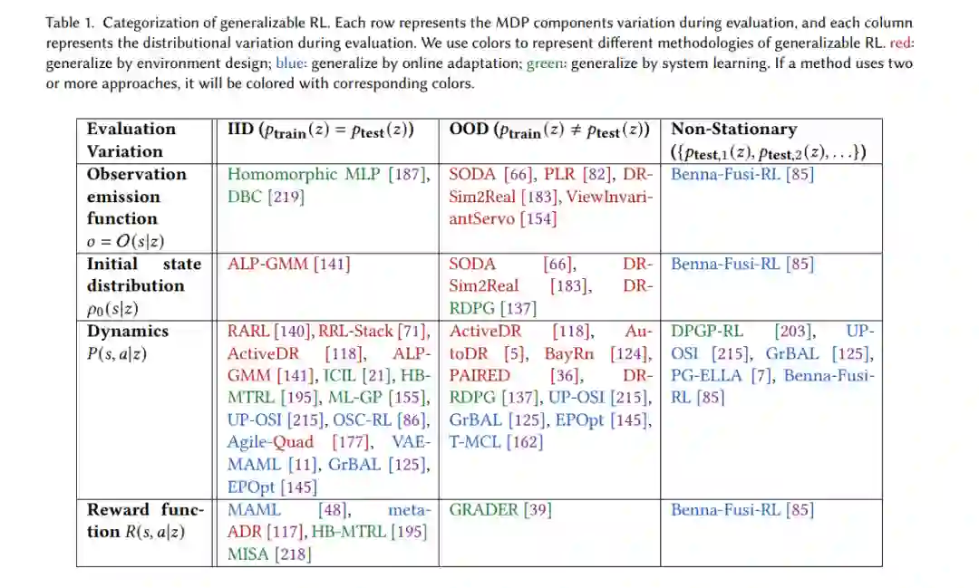 强化学习中的泛化侧重于设计算法,以产生可以迁移或适应各种环境的策略,而不会对训练环境过度拟合。这种能力对于现实生活中RL智能体的部署至关重要,因为测试时的环境通常不同于训练环境,或者本质上是动态的。现有的一些调查根据他们的方法[88,188,225]对RL泛化研究进行了分类。然而,在本次调查中,我们采用了一种不同的方法,根据他们的评价变化进行分类。