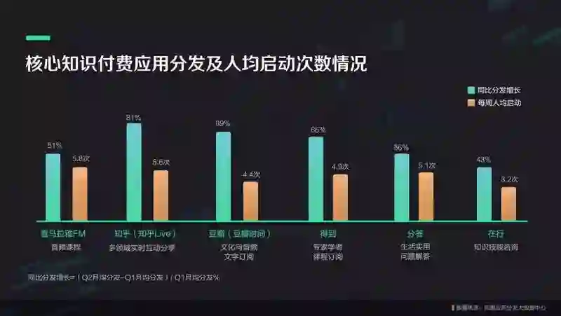 近一个季度以来,喜马拉雅FM、知乎、豆瓣、得到、分答、在行等app都有明显的增长。六大知识付费app中,有5家同比增长率都在50% 以上。其中,知乎(知乎Live)增长较快,同比上一季度月均分发增长了81%。