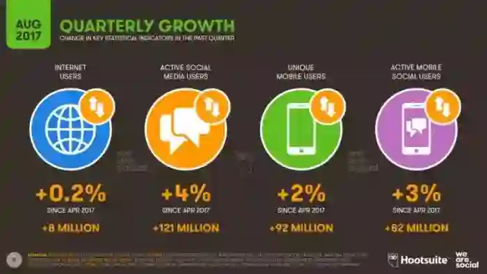 事实上,社交媒体用户数量的增长表明,互联网使用率以同样速度持续增长。 Facebook在过去4个月中用户数量大幅增长,平均每个月的活跃用户数达到了20.6亿人。