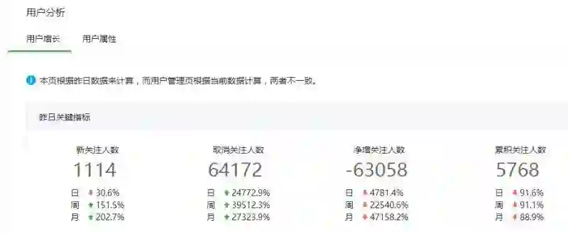 新榜向微信官方求证并获得回复称,今晨,微信公众平台后台“用户分析”中,出现取关人数统计异常,目前正在紧急修复中。
