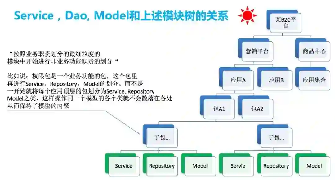 同时我也见过一些项目,应用逻辑架构比较明确了,但是在落地到物理架构时,把逻辑架构中的所有模块都放在 service 包里,而且没有再分包,这就不合适了,逻辑架构中的模块完全没有落地。