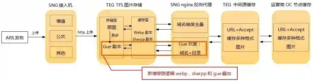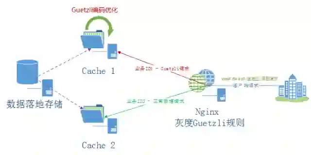 因此,最终落地方案设计时,没有对是否叠加压缩进行强制限制。即Guetzli与原有压缩访问架构在源站并行部署,各自覆盖对应适用场景并且有一定几率叠加使用。最终落地方案架构如图所示: