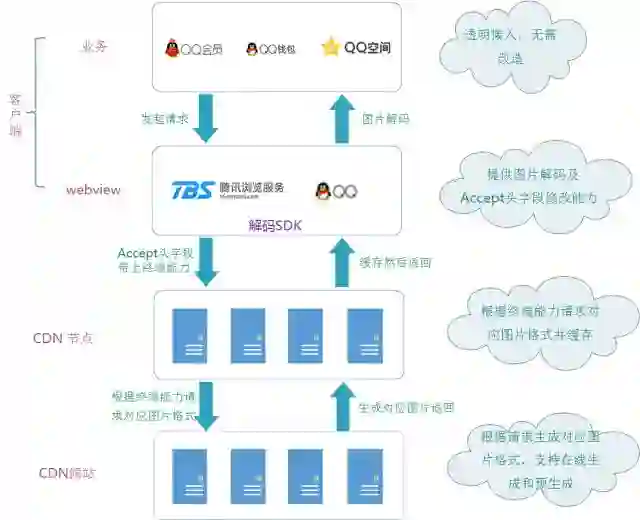 腾讯浏览器、QQ APP的WebView中预埋WebP/SharpP解码SDK,并向上提供Accept头字段的自动修改能力及图片解码能力;