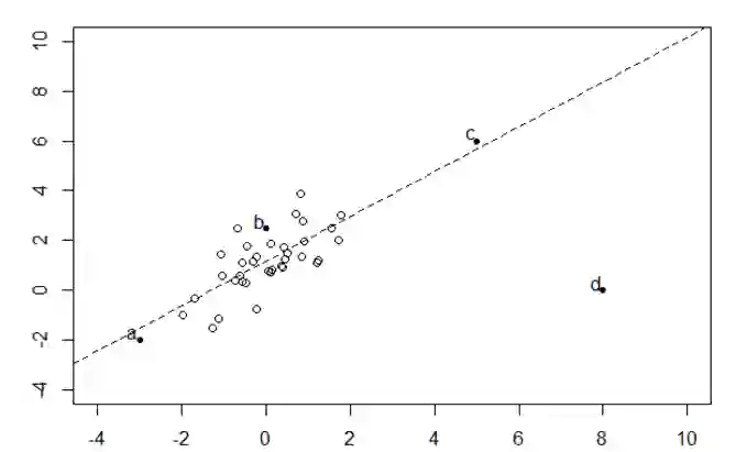 参考如下数据集,移除哪一个黑点将会对回归拟合线(黑虚线所示)产生最大影响