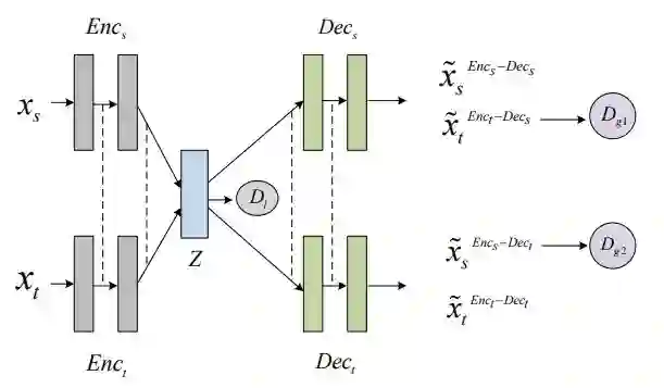 Encoder和 Decoder之间的虚线部分,即提取和分解句子的高级特征的部分被两个 Encoder和两个 Decoder共享。