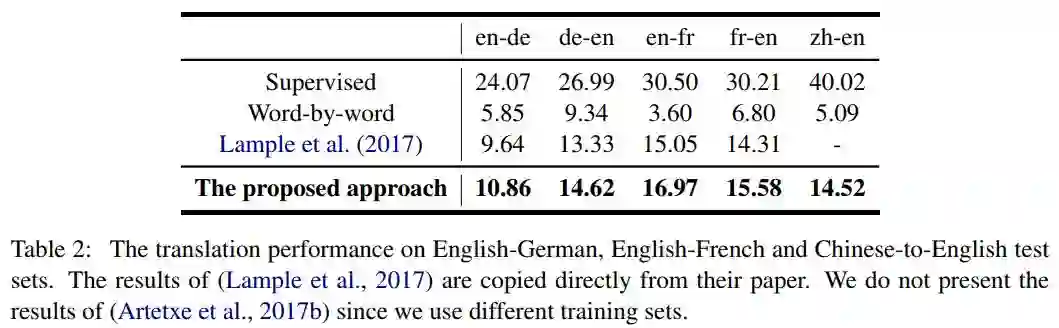 对比了目前state-of-the-art 的无监督机器翻译方法,本文提出的方法全面领先。