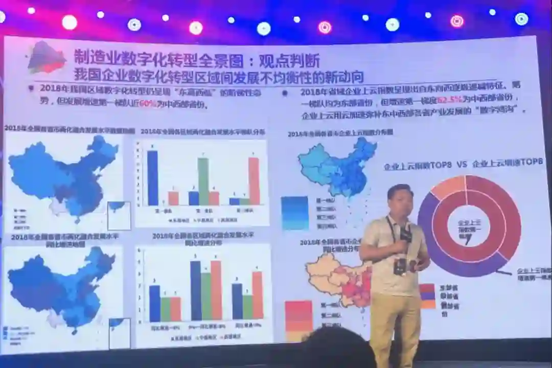 我们发现企业数字化转型、区域之间发展不平衡出现了明显的新动向,什么意思?大家都知道一般来说,数字化转型或者数字化一定是东南沿海到中部、内陆,中部、中西部,中部差一点,西北更差,但是实际上我们发现,现在处在转型发展或者是数据上云,处在第一梯队的60%是中西部省市加速度最快,反而不是东南沿海。在转型方面各地区都没有重大的突破。东南沿海做完基础性工作,进一步的工作并没有做太好,中西部很容易就赶上了。