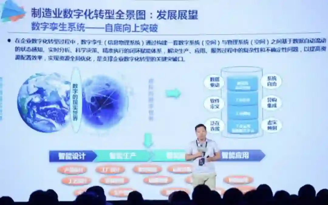 我们把所有这些底层的物理系统都做出数字孪生系统来,我们不指望在设备层面解决这个问题,我们在数字孪生系统解决互联互通互操作的问题。所以说我们只有通过制造能力和IT能力的集成融合和创新,我们让我们的制造业搭上IT这列快车,走向横向发展的道路。