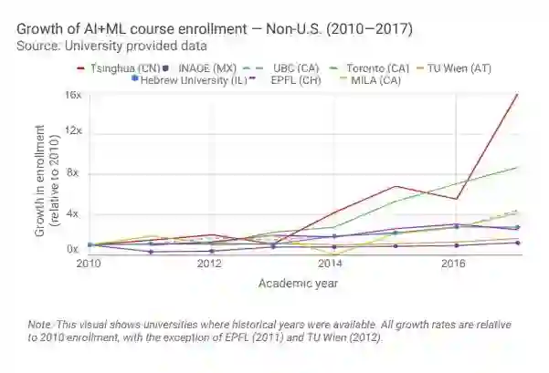 中国清华大学的 AI + ML 课程在 2017 年的报读人数是 2010 年的 16 倍。