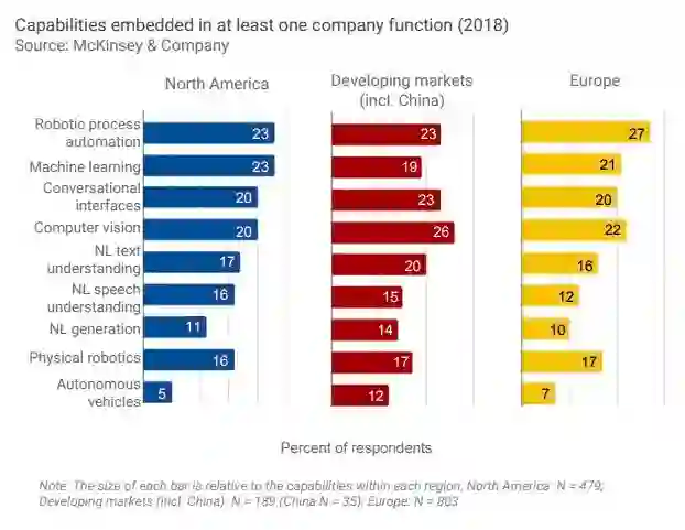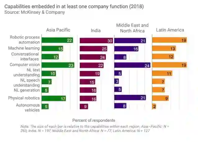 下图展示的是麦肯锡公司针对 2135 名企业雇员的调查结果,可以反映 AI 技能在企业业务中的使用情况,涉及地区包括北美洲、发展中国家(含中国)、欧洲、亚太地区、印度、中东与北非和拉丁美洲,