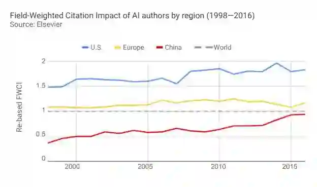 中国在 2017 年产出全球 25% 的 AI 论文(排名第一的欧洲也才 28%),AI 论文发表数量与 2007 年相比,增幅将近 150%,然而论文影响力部分依然存在增长空间。