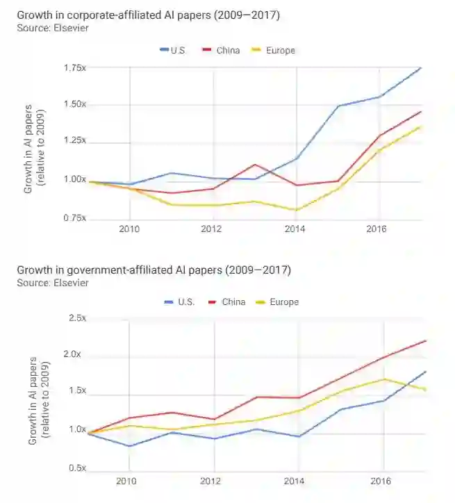 美国的 AI 论文很大比例都是由企业产出的,单就 2017 年而言,其企业署名 AI 论文的比例是中国的 6.6 倍,欧洲的 4.1 倍。