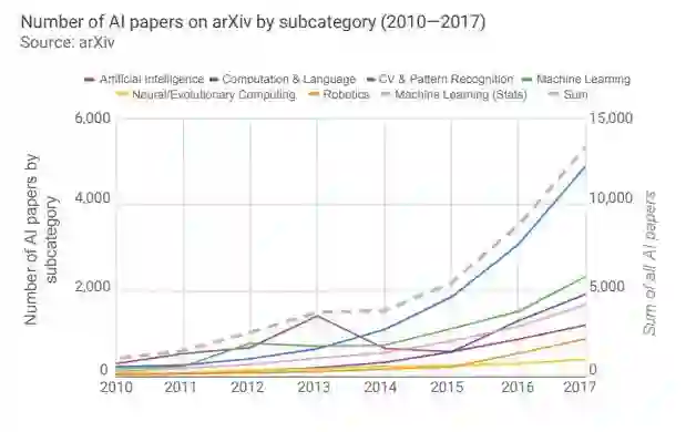 自 2014 年开始,计算机视觉与模式识别一直是 arXiv 上为数最多的 AI 子类论文,2014 年之前,该子类论文在增长上还是紧随人工智能子类和机器学习子类之后。