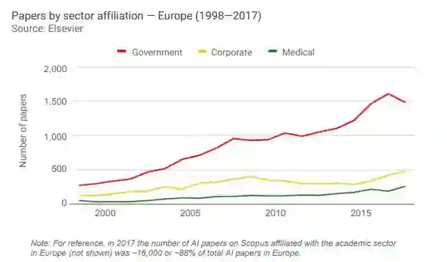 欧洲继续稳坐 AI 论文发表户的头把交椅,在 2017 年产出全球 28% 的 AI 论文。
