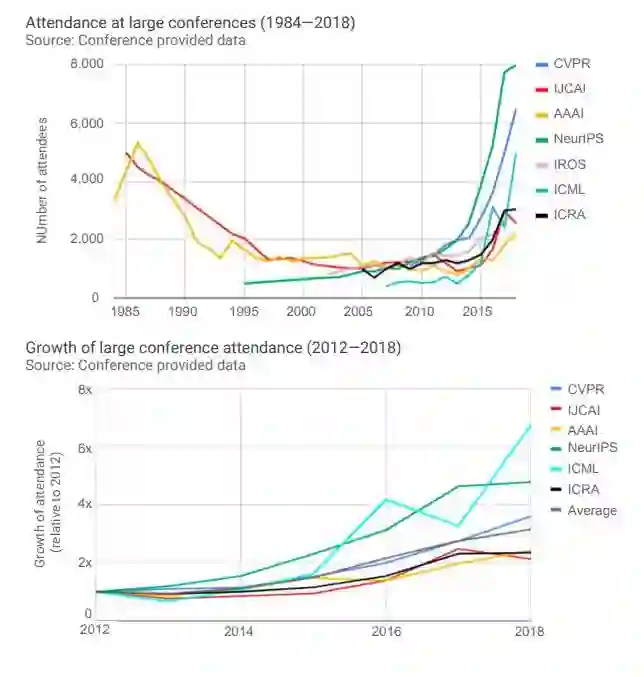 NeurIPS (原 NIPS )、 CVPR 和 ICML 作为出席率最高的 AI 顶会,它们的出席增长率(自 2012 年以来)同样也是最高的,当中又以 NeurIPS 和 ICML 的增长速度最快,分别达到 2012 年的 4.8 倍 & 6.8 倍,说明 ML 作为 AI 子领域持续受到大家的密切关注。