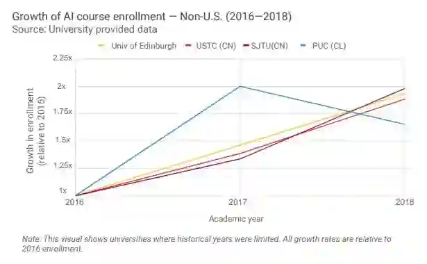下图展示了美国地区以外几所计算机学科处于领先地位的大学,它们的 AI + ML 相关课程的注册情况。第一张图展示这些院校在 2010 年——2017 年的课程注册增长情况,第二张图则展示的是 2016 年——2018 年的课程注册增长情况。关于院校的选择标准、实际入学人数及完整高校名称可参阅报告中的「附录」。