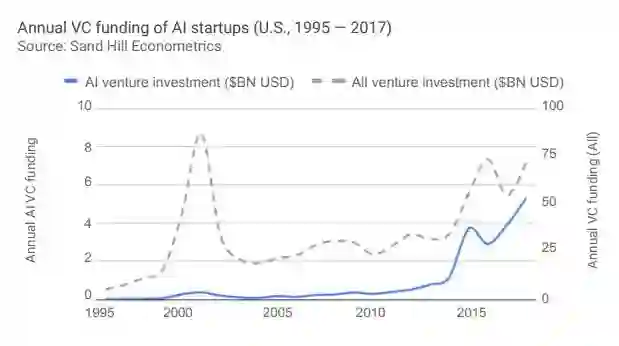 从 2013 到 2017 年,AI 初创企业的融资金额增加了 4.5 倍,综合初创企业则增加了 2.08 倍。