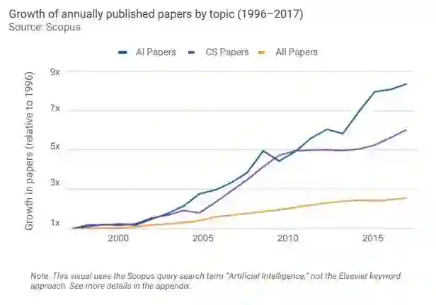 与 1996 年相比,AI 学术论文的年度发表率增加 8 倍,计算机科学学术论文则是 6 倍。