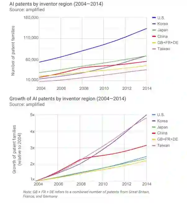 2014 年,30% 的 AI 专利源自美国,韩国和日本分别以 16% 排在第二、第三。