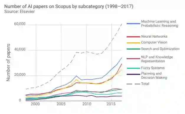 紧随其后的中国在 2017 年产出全球 25% 的 AI 论文,AI 论文发表数量与 2007 年相比,增幅将近 150%(尽管 2008 年前后曾出现异常波动)。
