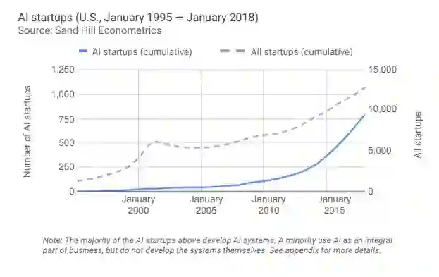 2015 年 1 月—2018 年 1 月,活跃的 AI 初创企业增加了 2.1 倍,综合领域的初创企业则是增加了 1.3 倍。