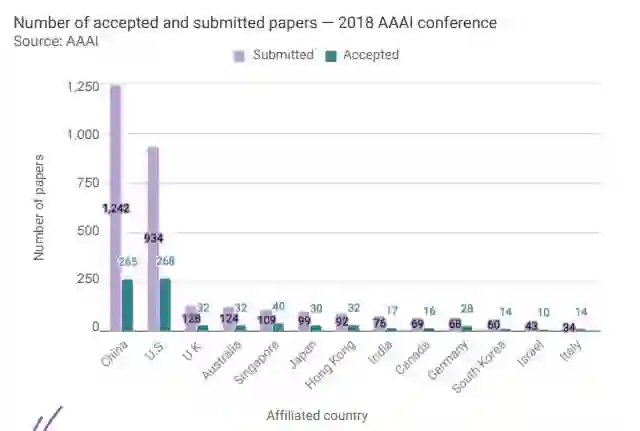 下图展示了 2018 年 AAAI 大会的论文提交与接收情况(按国别统计),大会于 2018 年 2 月份在美国路易斯安那州新奥尔良市举行。