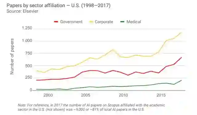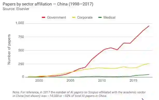2017 年,中国政府署名 AI 论文的产量几乎是中国企业署名论文的 4 倍。自 2007 年以来,中国政府署名 AI 论文经历了 400% 的增长,同期中国企业署名 AI 论文的增长只有 73%。