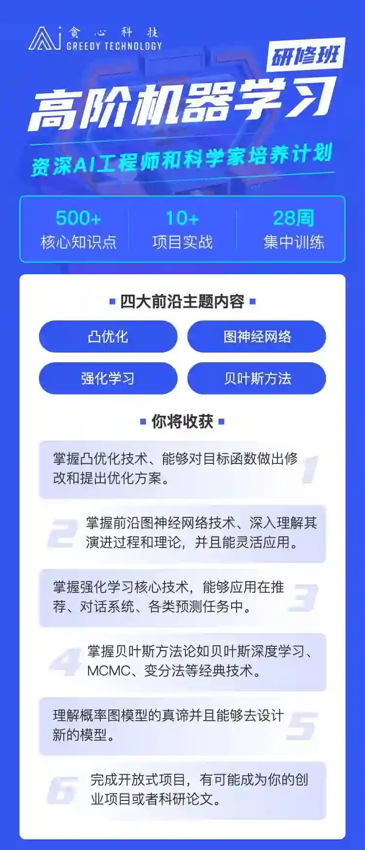 如果你准备发AI方向的论文,或准备从事科研工作或已在企业中担任AI算法岗的工作。那么我真诚的向大家推荐,贪心学院《高阶机器学习研修班》,目前全网上应该找不到类似体系化的课程。课程精选了四大主题进行深入的剖析讲解,四个模块分别为凸优化、图神经网络、强化学习、贝叶斯深度学习。
